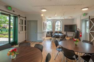 The newly refurbished Barn and Carriage House buildings can be set up with cocktail tables, seated tables, lecture style, or meeting style. The space includes access to the upstairs kitchenette, facilities, and a screen.